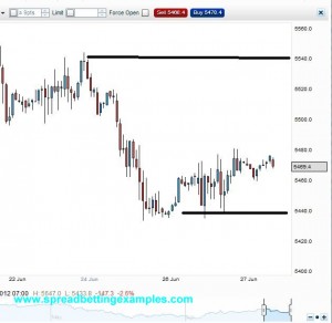 Here is a example of the FTSE 100. In this example lets assume you have already decided that you will spread bet the FTSE 100 up.